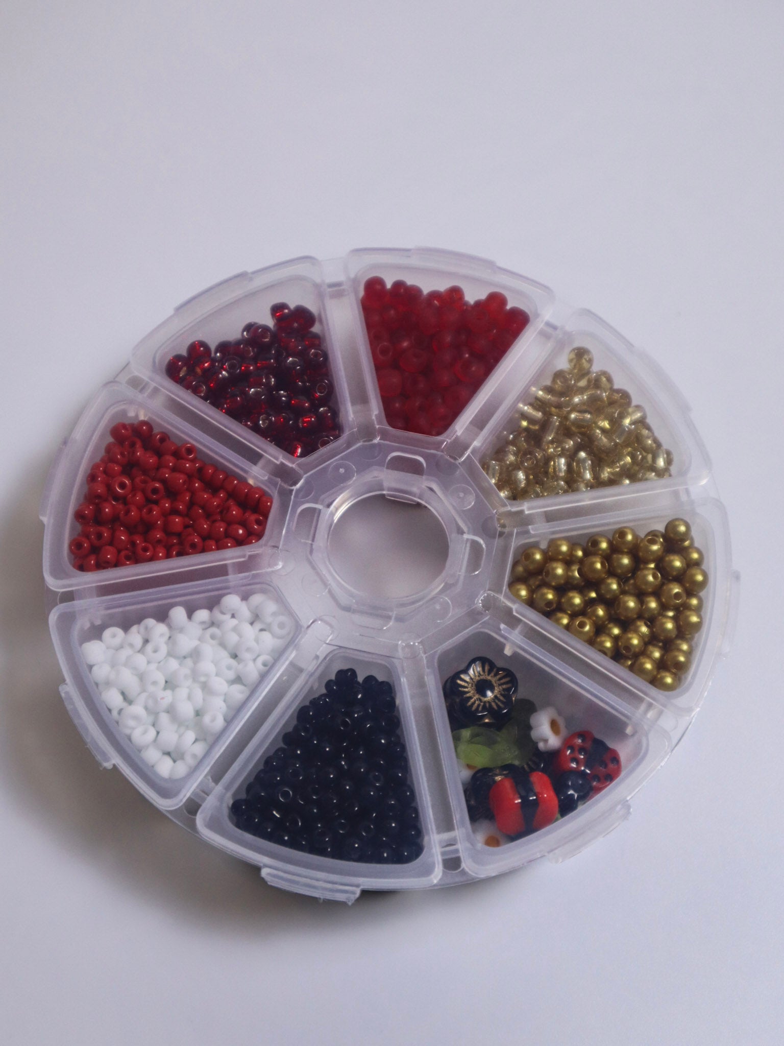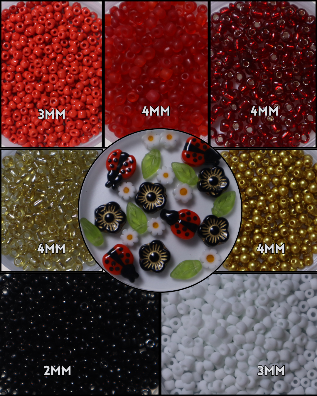 Decorative beads: ladybugs, daisies, green glass leaves, black/gold Czech flowers, sparkly red diamonds