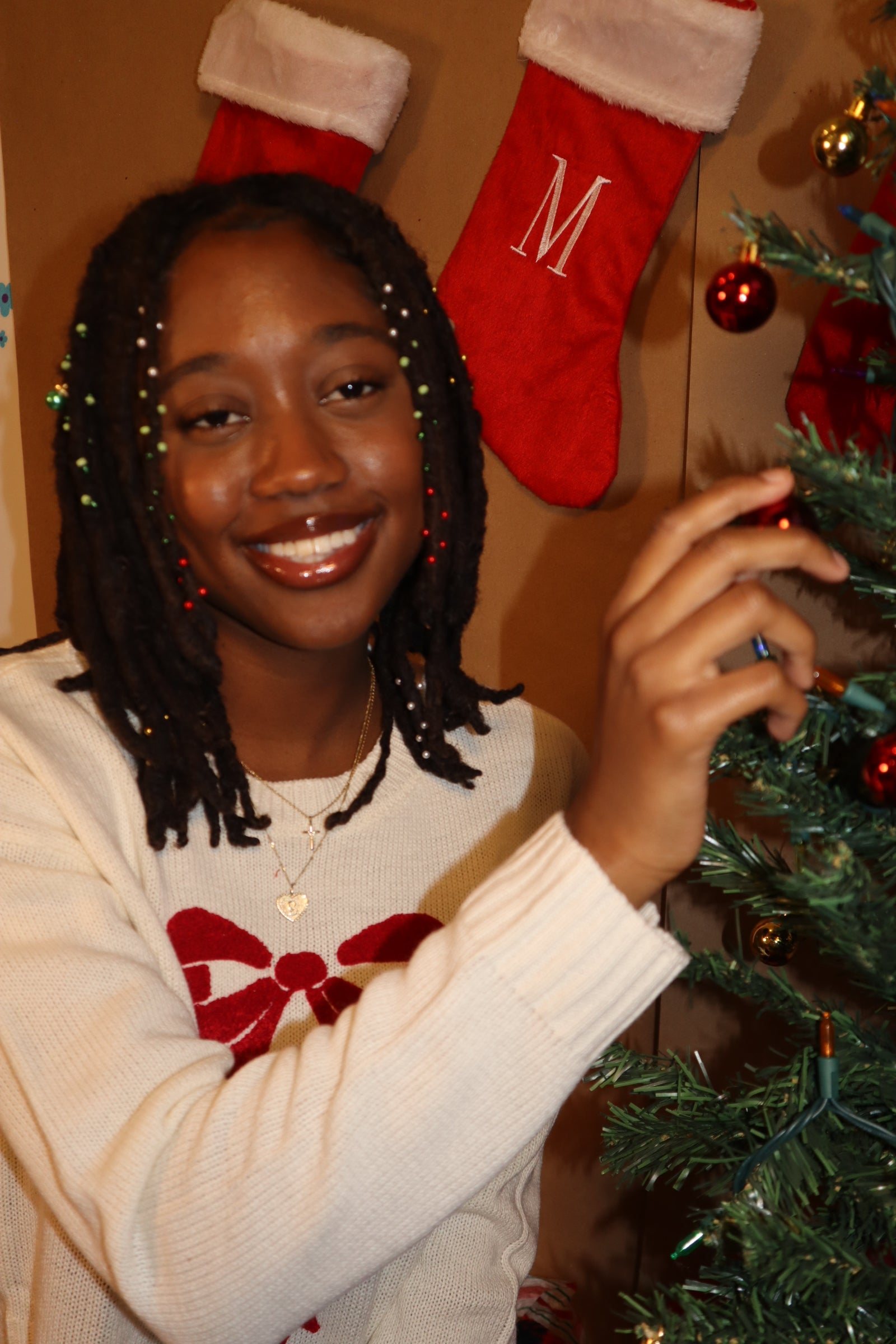 A mix of 3mm-4mm glass & plastic seed beads, ornament charms, pearl bows, accents, red & white crystals, and elegant statement beads ushc as brown pearls ✨