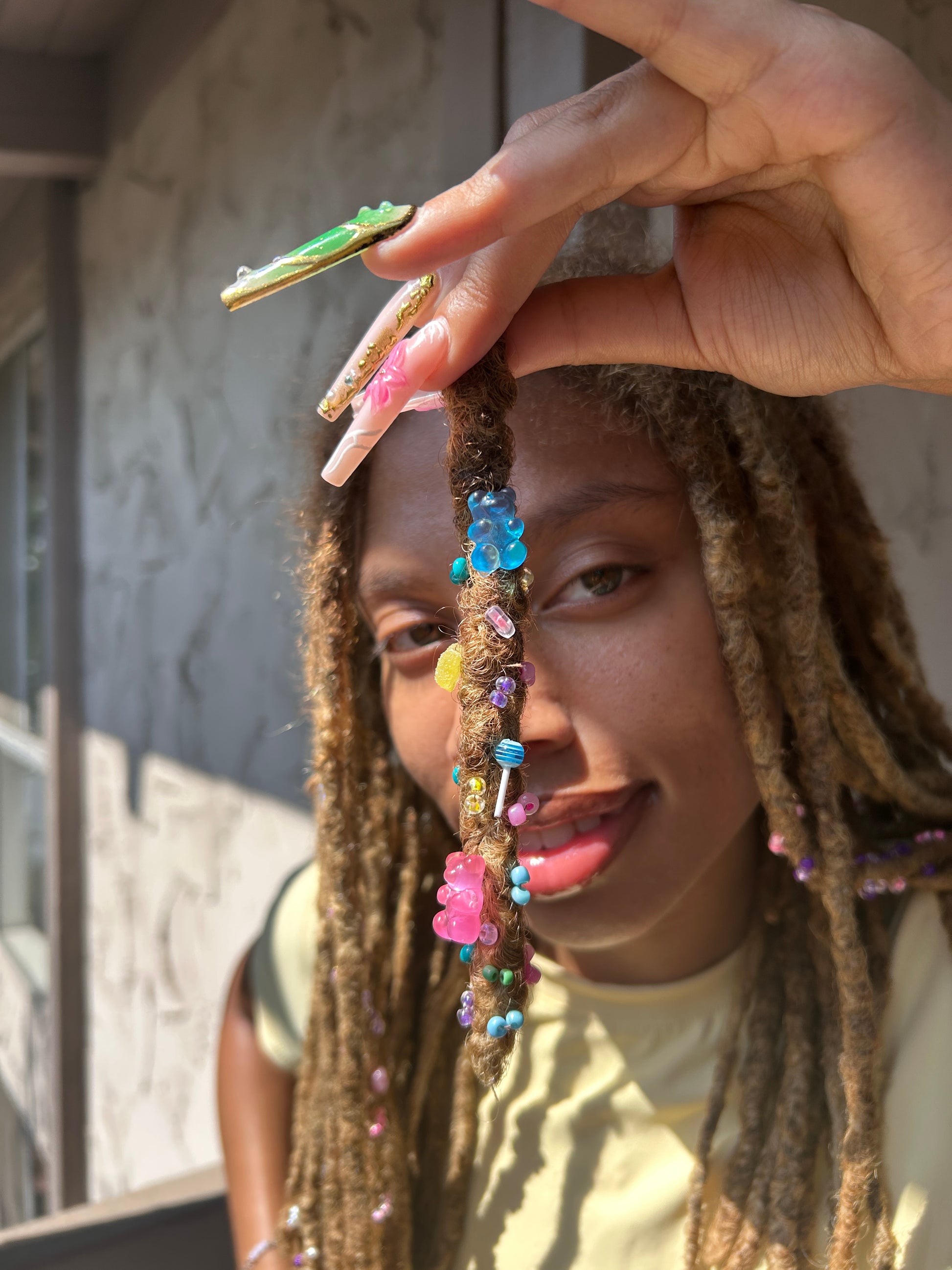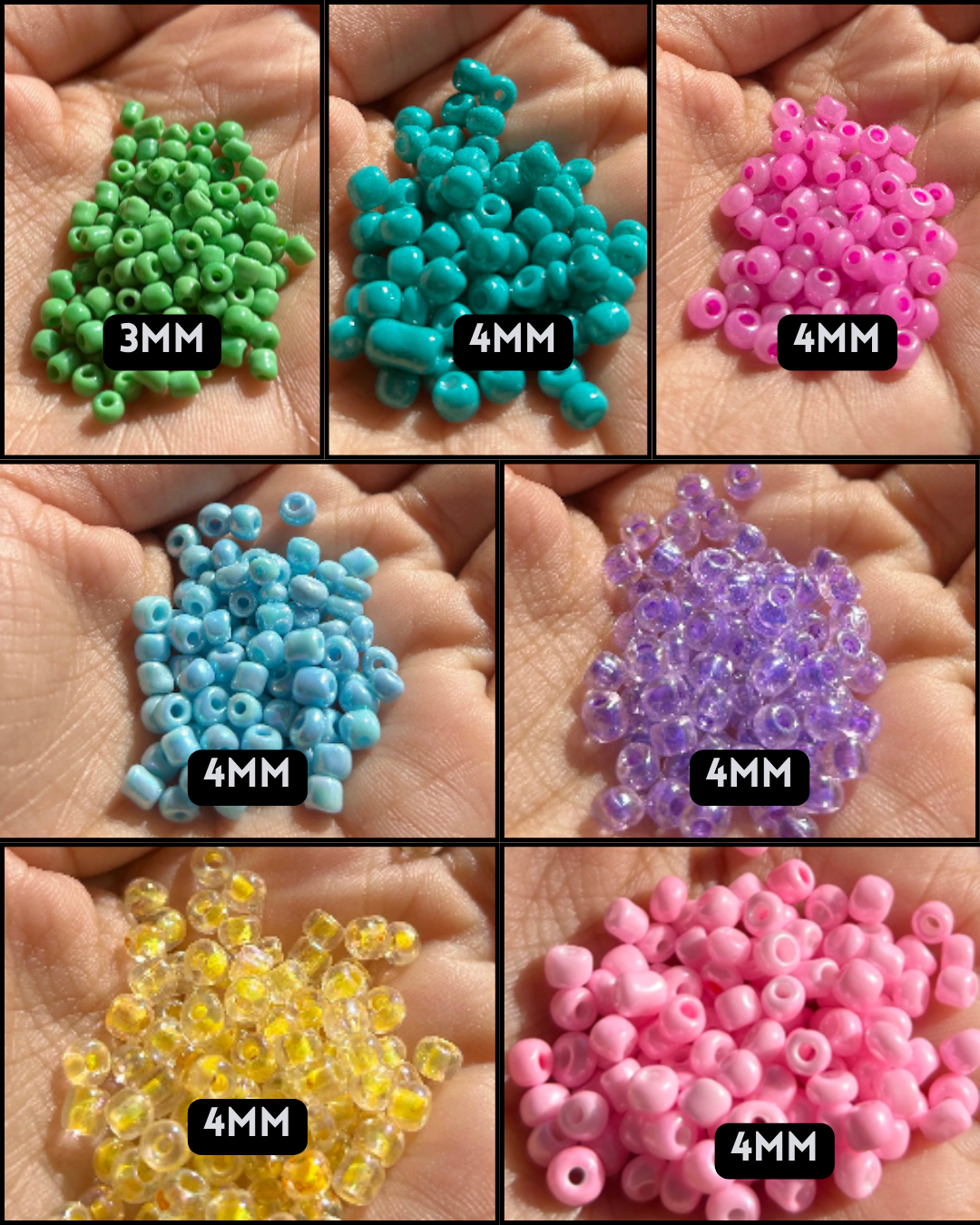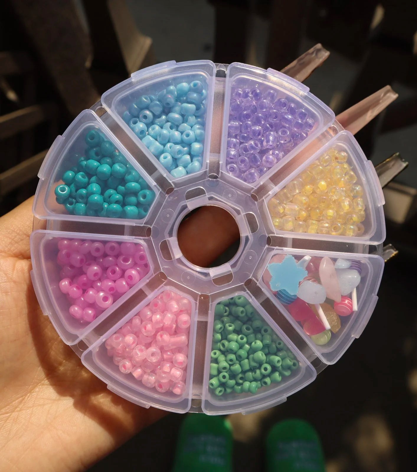 A mix of 4mm glass & plastic seed beads, multicolor gummy bears, lollipops, gumdrops, and a spoonful of pink and blue crystal gemstone chips.