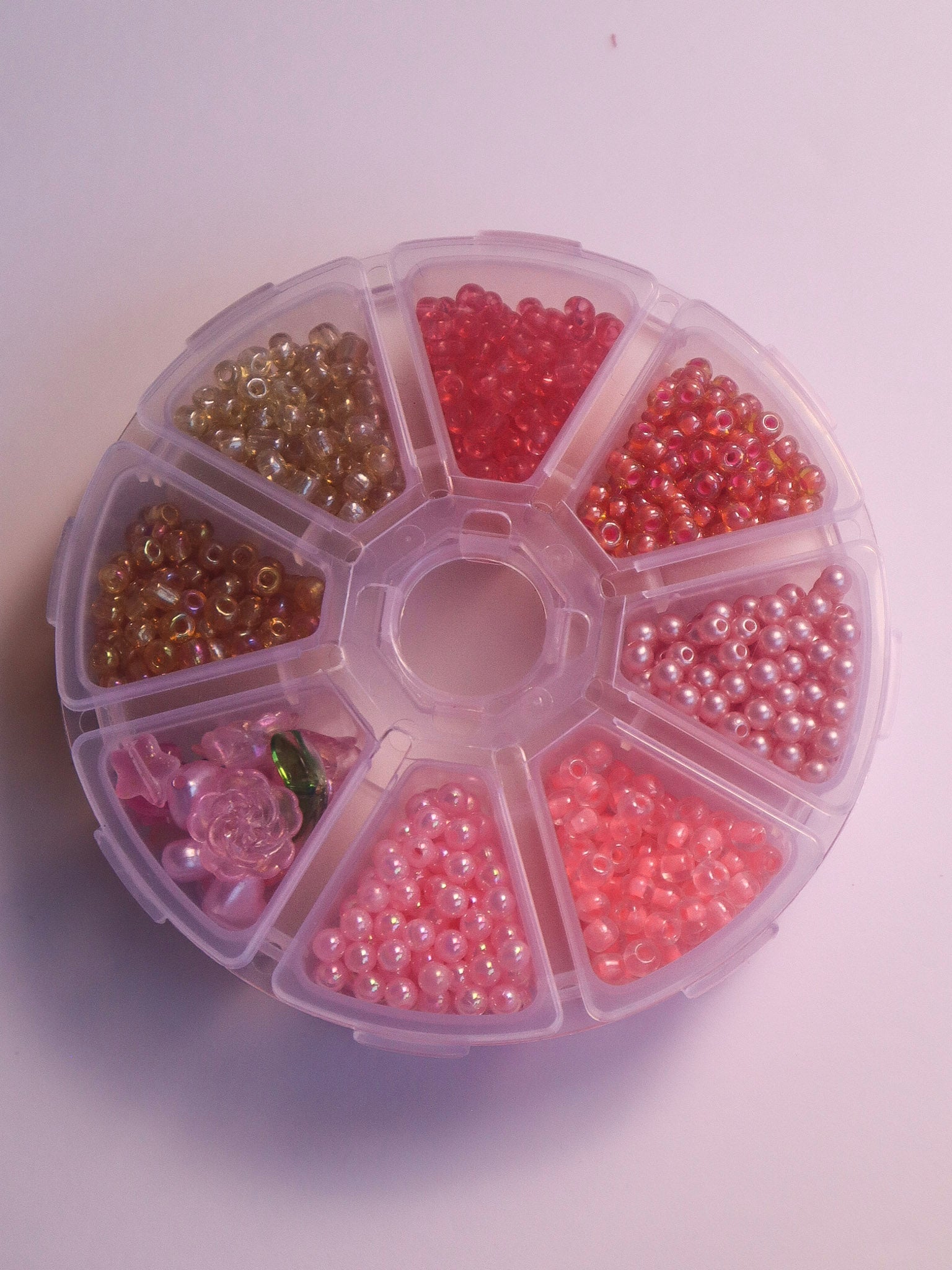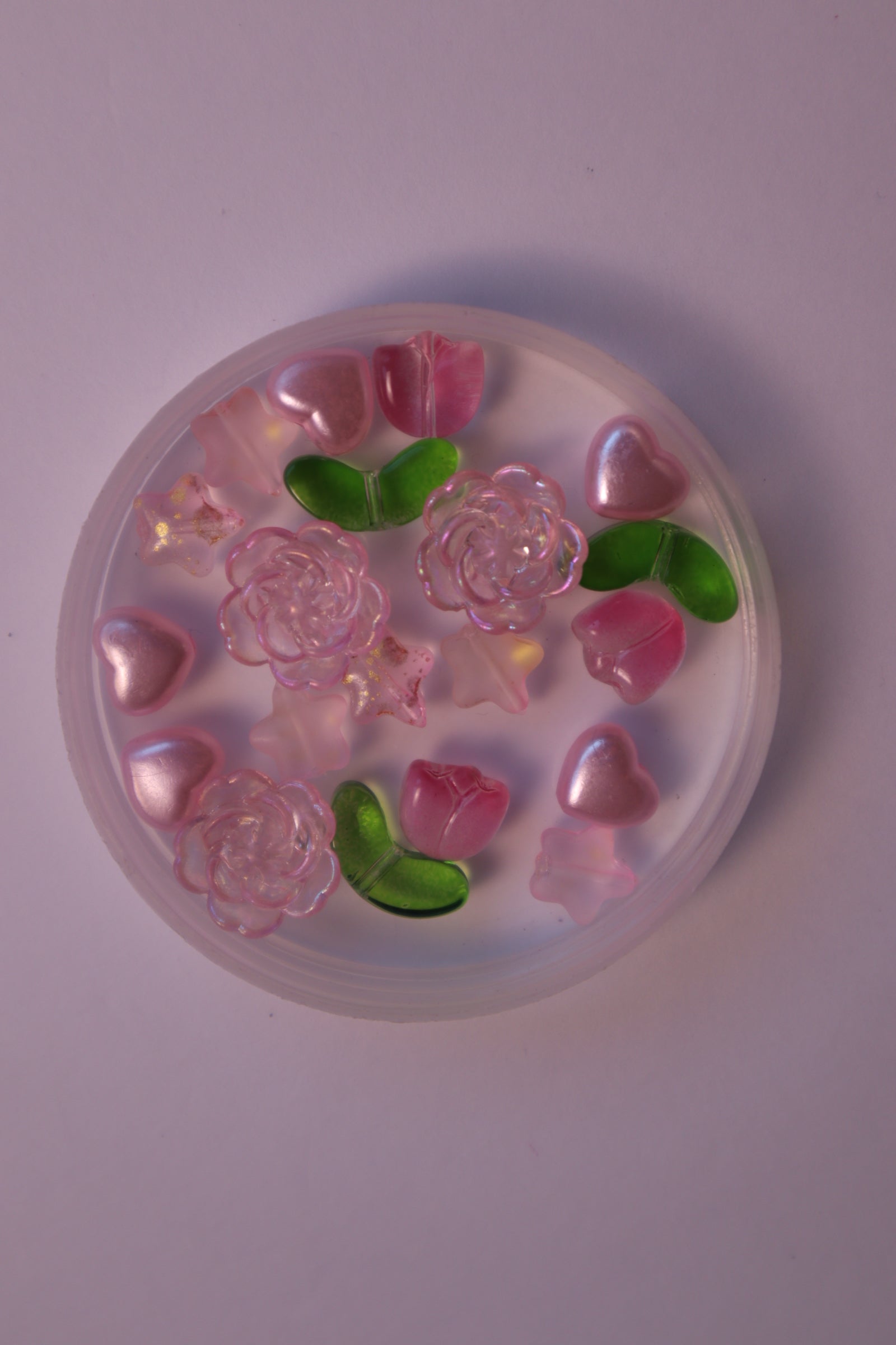 A mix of 4mm glass & plastic seed beads, pink flower beads, pink tulips with separated green leaves, pearly pink hearts, and pink hearts.