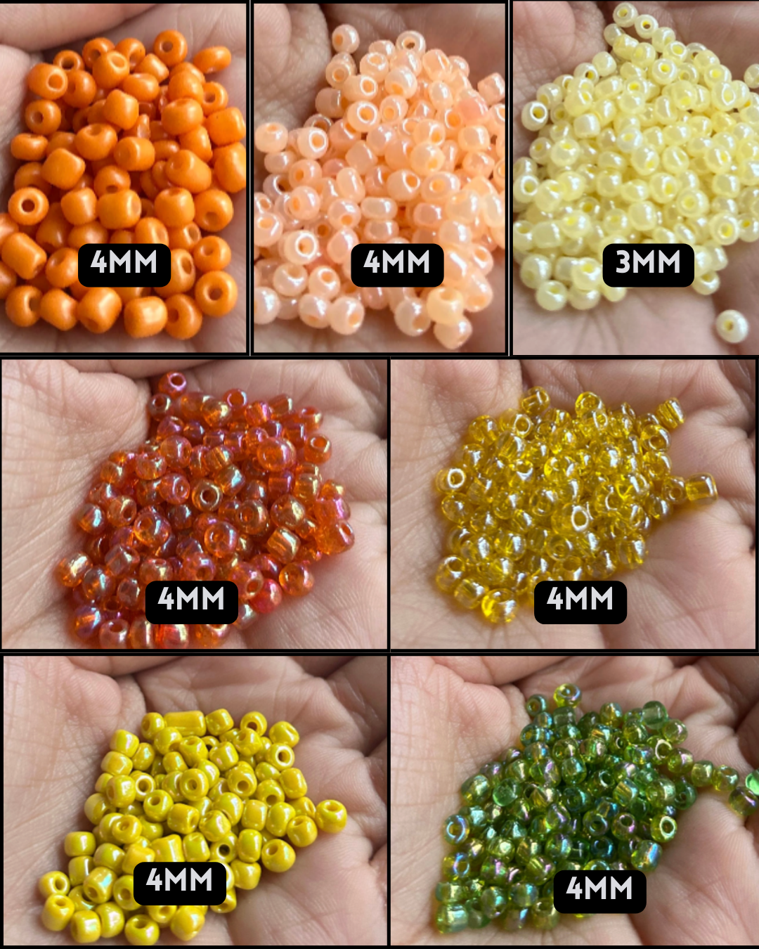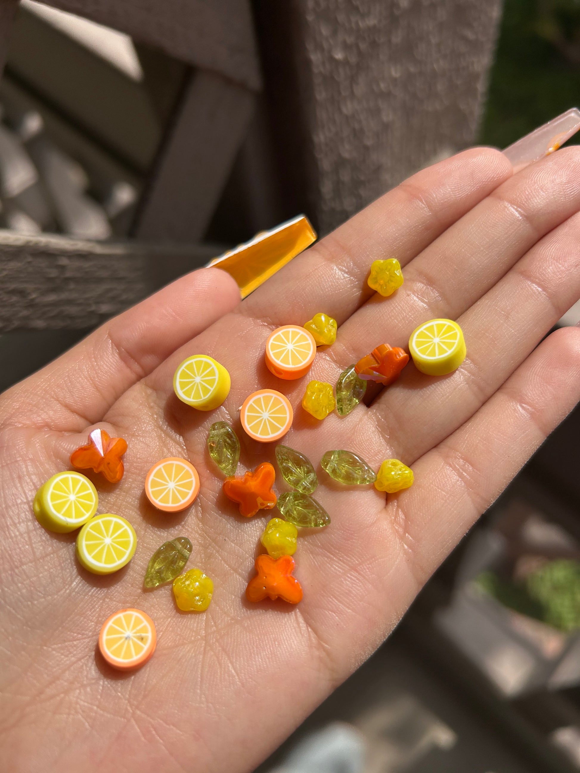 A mix of 4mm glass & plastic seed beads, lemon & orange clay beads, glass green leaves, orange butterflies, yellow czech glass flowers.