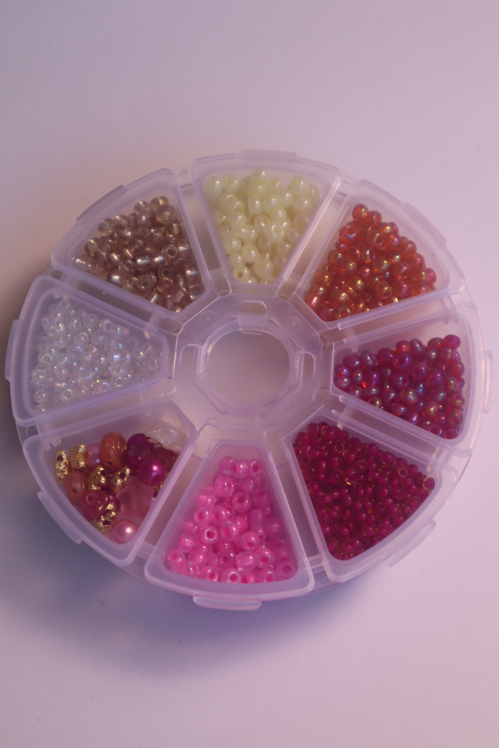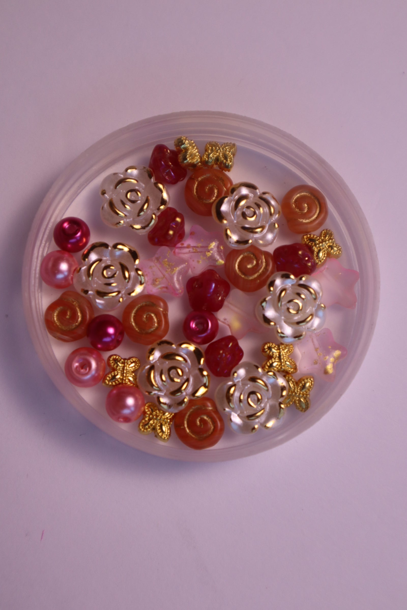 A curated mix of 4mm glass and plastic seed beads, 18K gold-filled butterflies, white and gold flowers, peach-toned Czech glass snail beads, dark pink Czech hibiscus glass flowers, and other beautiful accent beads. Each kit also includes your Sprinkle Tool Kit with a needle, thread in your chosen color, and a needle threader for easy installation.
